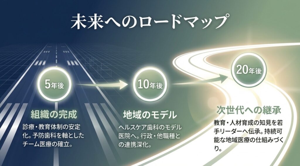 現在は「健康を守り、育てる」「価値観に寄り添う」「三方よし(患者さん・私たち・地域社会)」を理念に掲げ、治療中心ではなく、予防と対話を重視したヘルスケア型歯科医療を実践しています。患者さん一人ひとりの人生背景や価値観を尊重し、長期的な口腔の健康を共に考える医療を目指しています。