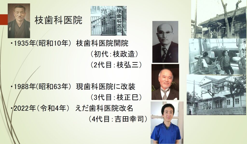 その後、義父が営んでいた歯科医院の事業承継をきっかけに歯科医師を志し、徳島大学歯学部へ進学。歯科医師免許取得後、臨床経験を積み、2021年にえだ歯科医院院長に就任しました。